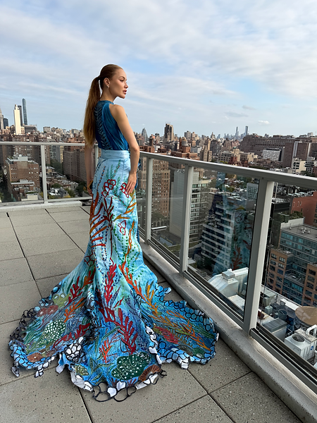 Runa Ray creates collections inspired by the ancient art of water painting, a technique that arrests water wastage and prevents contamination. By using natural, organic inks splashed directly onto the surface of water and absorbed by the fabric, her process eliminates the need for chemical dyes and synthetic printing methods.